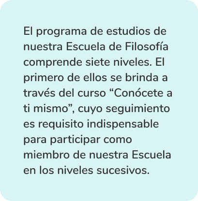 El programa de estudios de nuestra Escuela de Filosofía comprende siete niveles. El primero de ellos se brinda a través del curso “Conócete a ti mismo”, cuyo seguimiento es requisito indispensable para participar como miembro de nuestra Escuela en los niveles sucesivos.